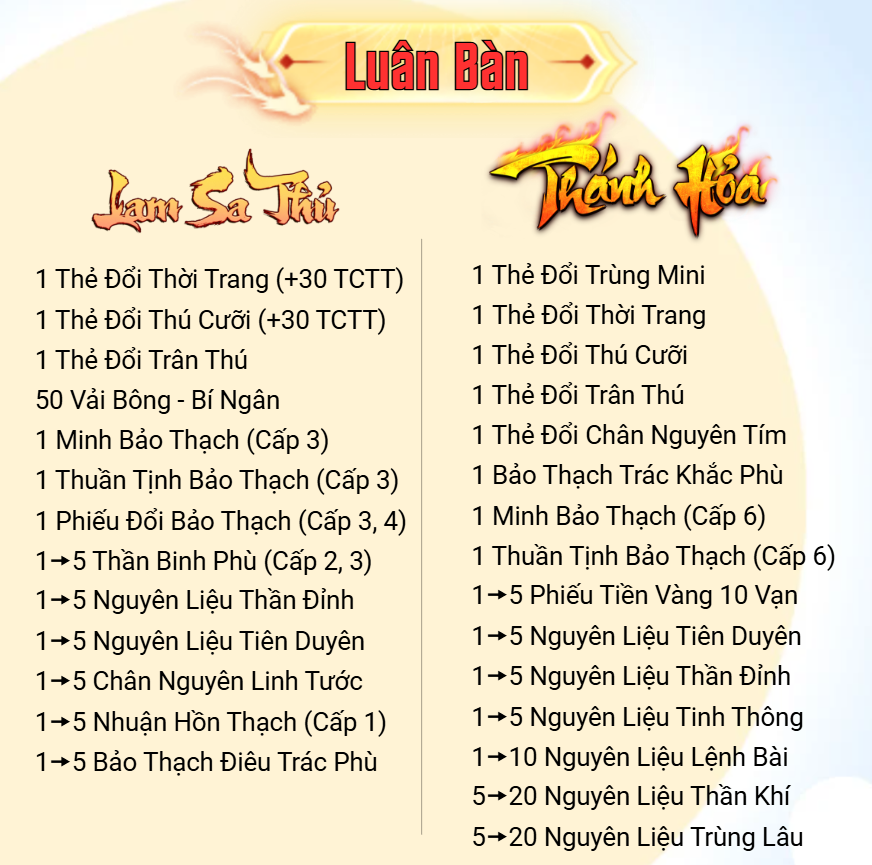 - Hạnh Vận Quả: dùng đổi vật phẩm tại Luân Bàn, số lượng vật phẩm tại Luân Bàn là ngẫu nhiên, tỉ lệ từ x1 đến x20 lần tại bảng hiển thị.