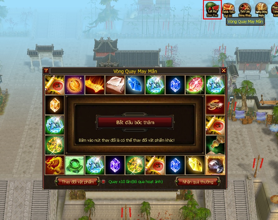 - Hạnh Vận Tử Châm: dùng để quay thưởng, 1 lần quay tiêu hao 1 tử châm. Sau khi nhận phần thưởng mới có thể quay tiếp theo (đạo hữu có thể chọn để quay thưởng 10 lần liên tiếp)